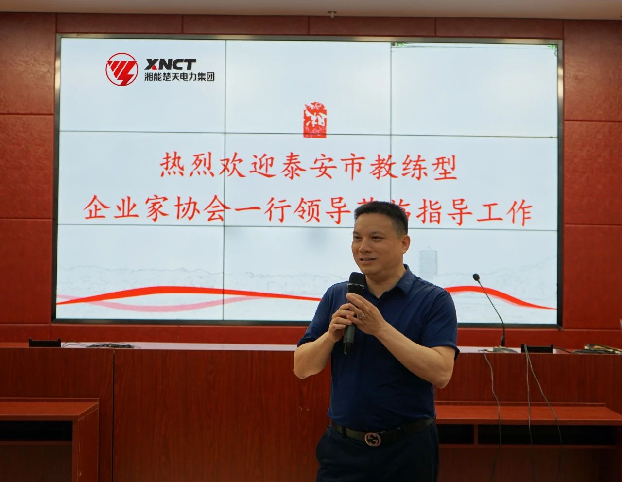 6月22日上午,由山東泰安巨鼎有限公司董事長、泰安市教練型企業家協會會長杜欣濤帶隊泰安市教練型企業家協會一行成員組49人蒞臨湘能楚天電力集團參觀指導工作,長沙市湘能楚天公益服務中心理事長、湘能楚天電力集團董事長陳偉其、行政后勤中心總監劉正安等陪同。